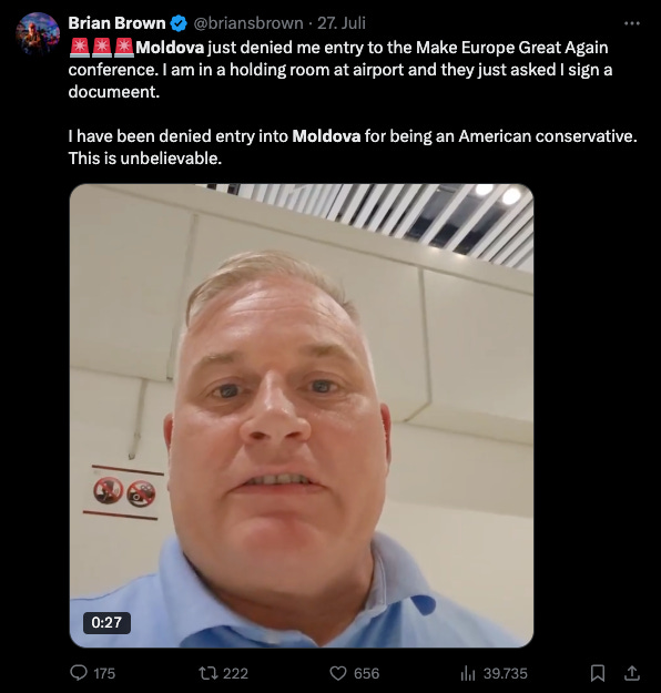 An example of this clownish thuggery which caused a diplomatic incident occurred about a month ago when a good friend, prominent and influential Christian pro-family Washington lobbyist, Brian Brown and several populist members of the European Parliament were detained for 24 hours at the Chisinau airport in July when trying to attend the Make Europe Great Again conference. He kicked up a row on Twitter and leaned on the US State Department and embassy, and was eventually allowed in: